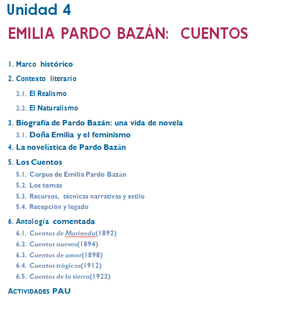 A continuación os dejamos el índice del tema 4, con las principales cuestiones a tratar. Con todo, y antes de empezar, os sugiero un documental de RTVE: Emilia Pardo Bazán, Inclasificable